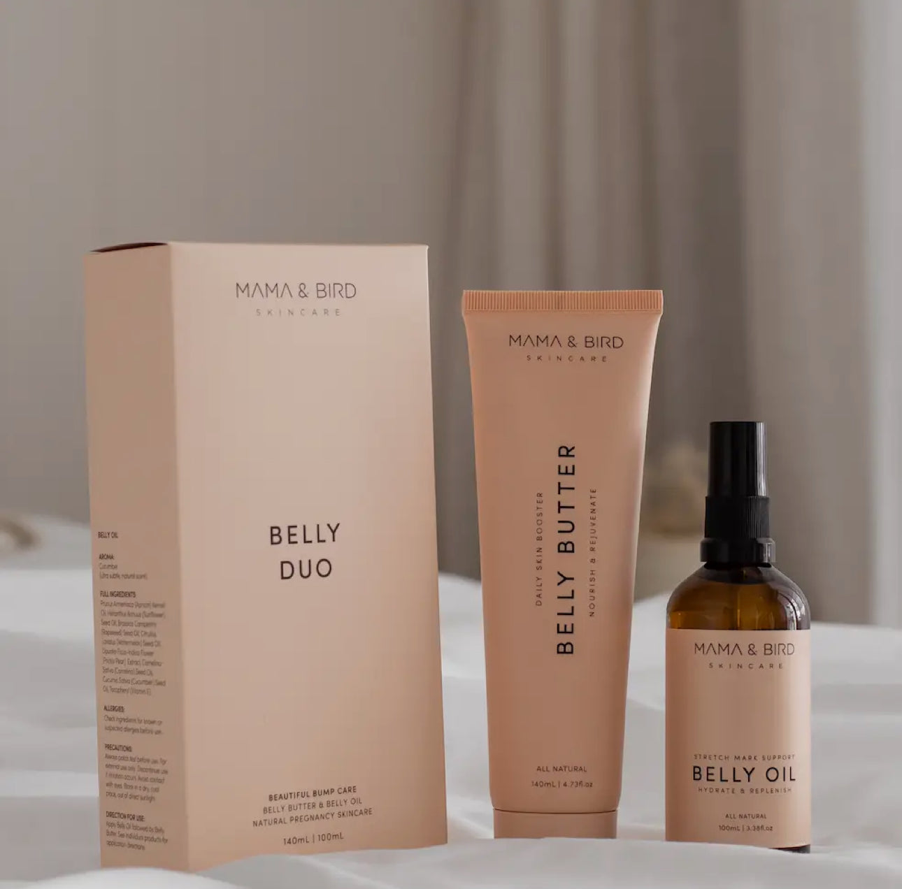BEAUTIFUL PREGNANCY BUMP CARE A gorgeous box set that includes our best selling Belly Butter & Belly Oil. Created with carefully selected natural ingredients, these two beautiful belly products work together to: - help prevent and reduce the appearance of stretch marks - relieve dry, itchy pregnancy skin - support your skin elasticity - boost hydration, and - promote healthy collagen production. Say goodbye to your itchy pregnant belly and hello to supple, smooth, ultra-hydrated skin that looks and feels radiant. Suitable for daily application. Both products are light and non-greasy. Australian Certified vegan, cruelty free, toxic-free & made safe.