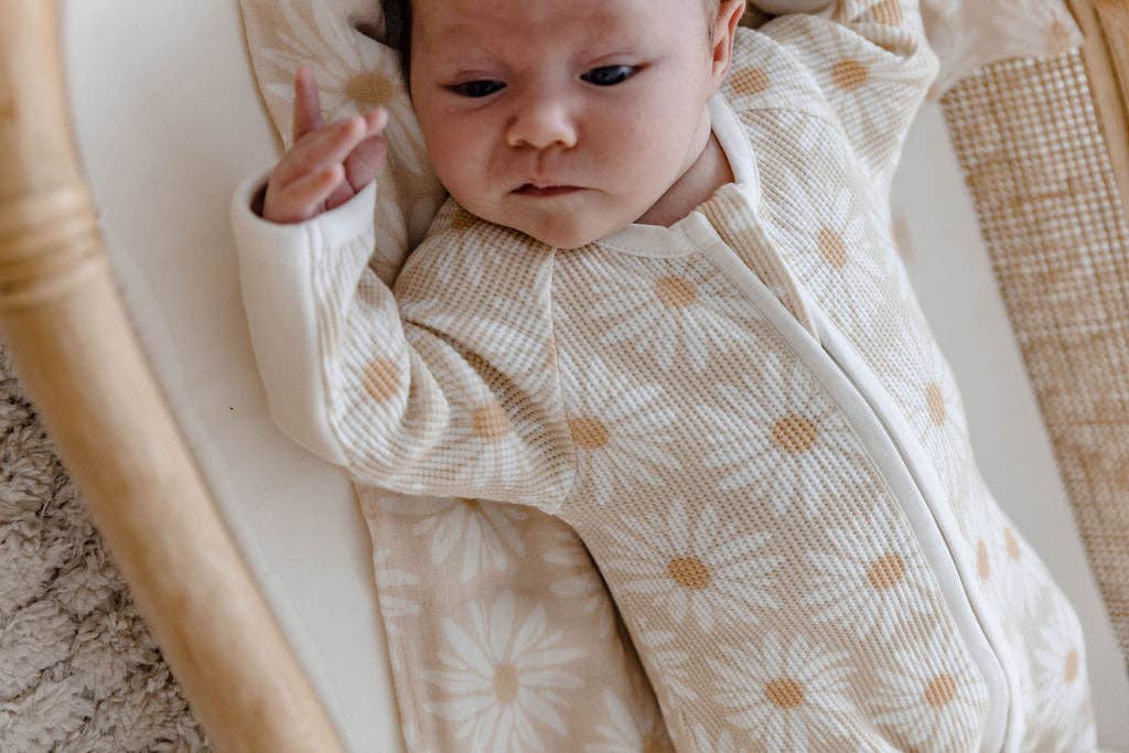 New and improved - Woven Kids zippy suit made even better! These waffle cotton zip suits are made for comfort - they get softer every wash and have a slight stretch to keep up with babies on the go  * Soft pink daisy print  * Extra soft jersey cotton hand and foot cuffs on all sizes for extra warmth * Double lined, two way zipper for easy nappy changes  * Fire hazard classification according to AS/NZS 1249:2014: hazard labels attached  * Sizing has room, model is 5 weeks old wearing size newborn  * 95% cotton 5% spandex  Please note we have increased the sizing for all of our zippys. These are made to last the full size bracket, we do not recommend sizing up