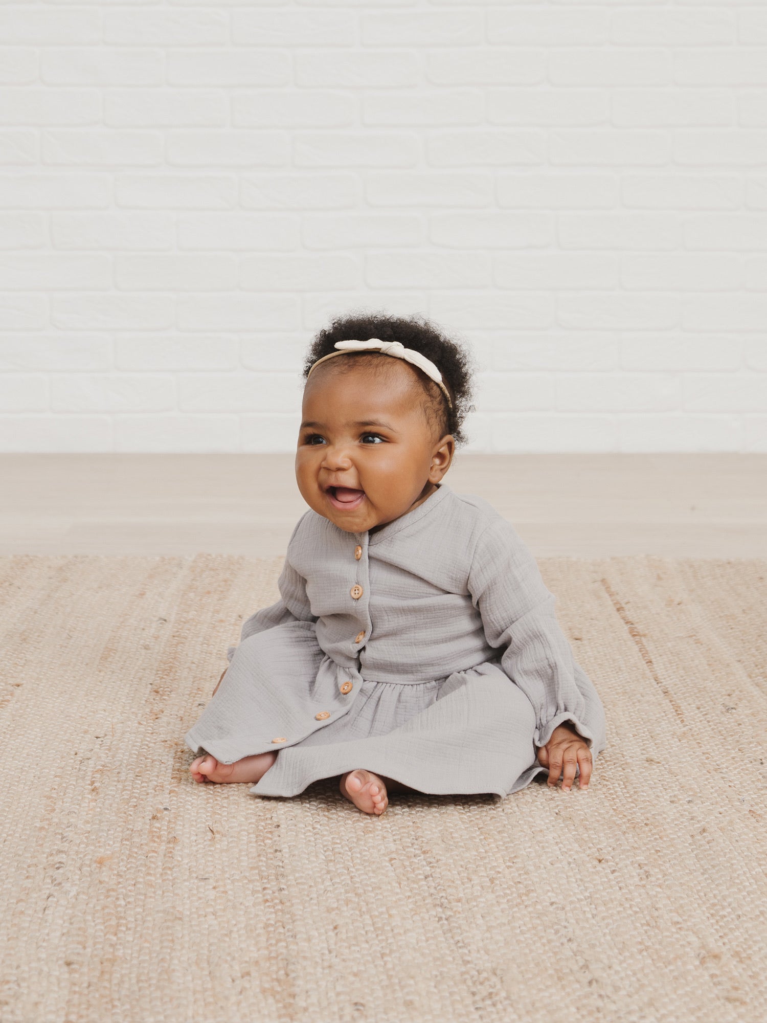 Longsleeve button down dress with elastic and ruffle at sleeve openings in an organic cotton gauze fabric.