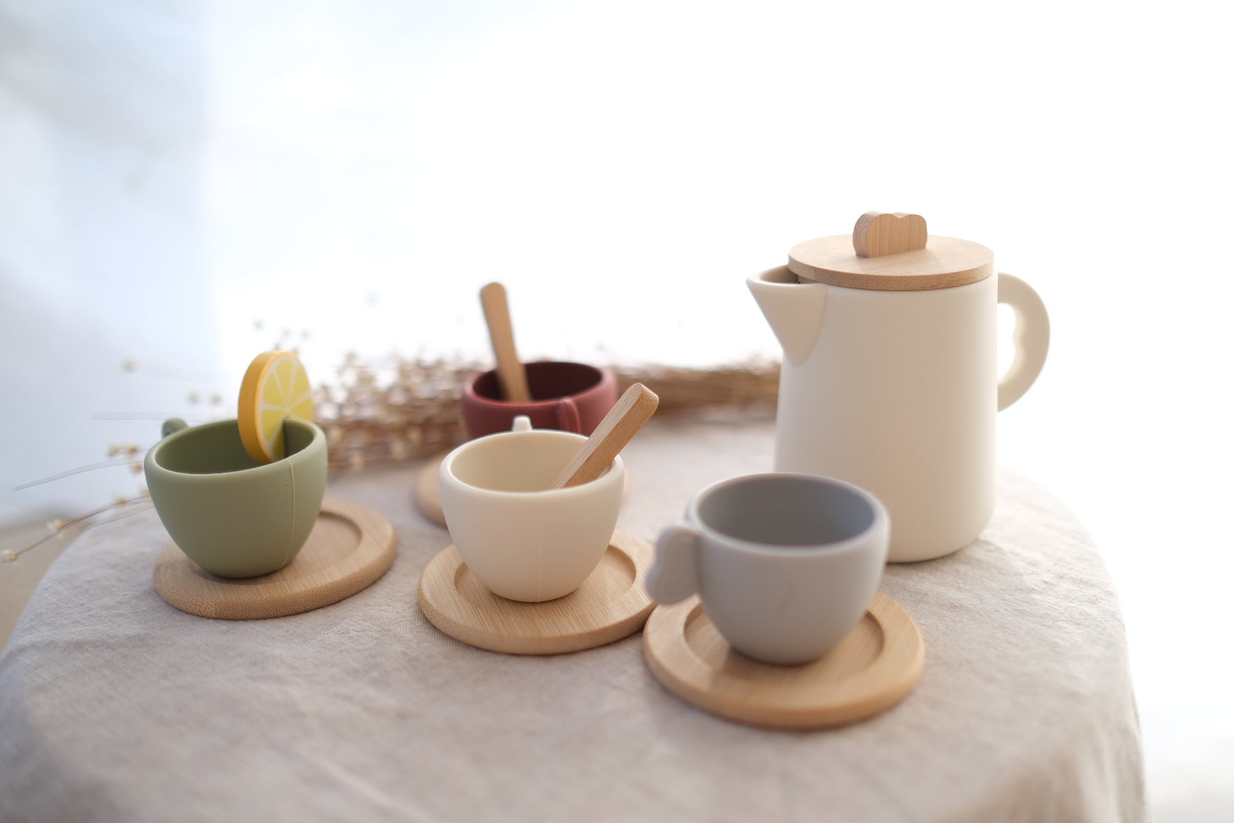 Spark your child’s imagination with our adorable silicone and wood tea set, perfect for cozy pretend tea parties! This beautifully crafted set includes a selection of colorful cups, wooden coasters, and a teapot with a charming wooden lid. Each set also comes in a dust-proof canvas bag, making it easy to store and carry for on-the-go playdates. Recommended for ages three and up, this set is designed with safety in mind but contains small parts, so it's ideal for kids ready for a bit more grown-up play. Let the tea party fun begin with this delightful, nature-inspired tea set!