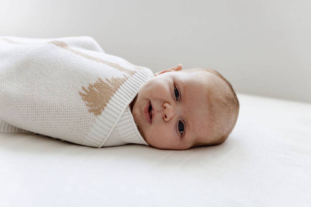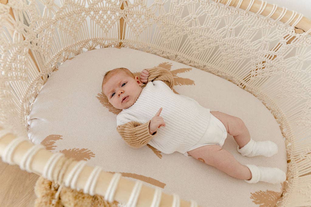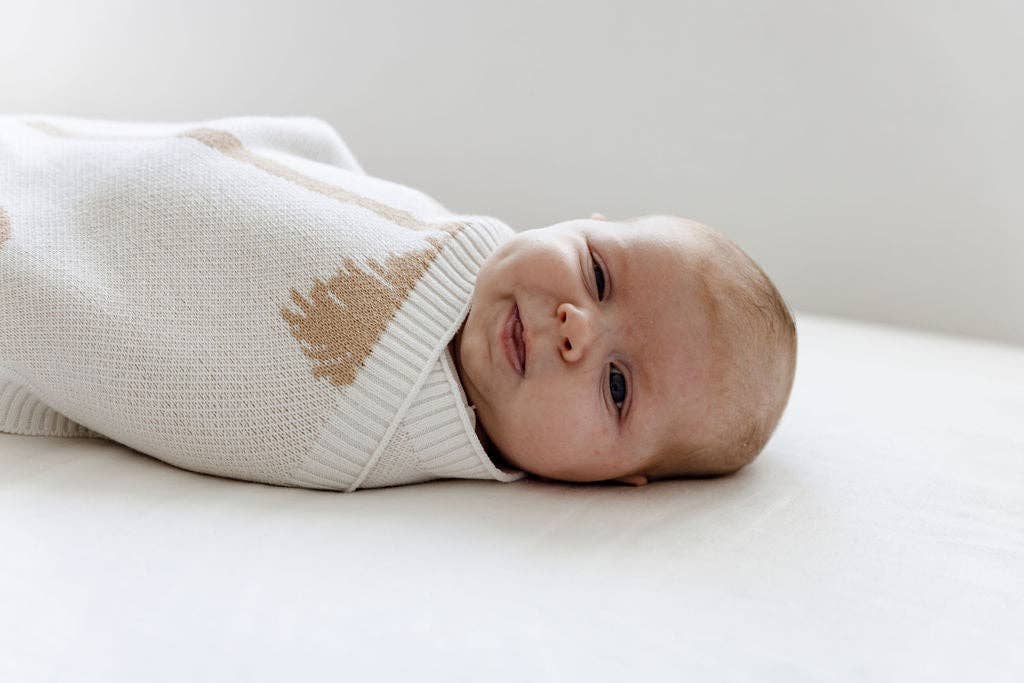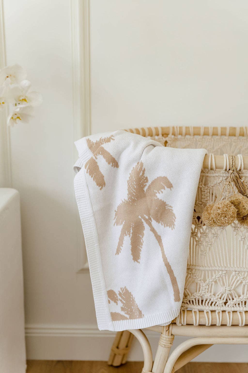 Keep your little love cosy in this super soft, custom knitted, neutral tan and white palm tree blanket!
