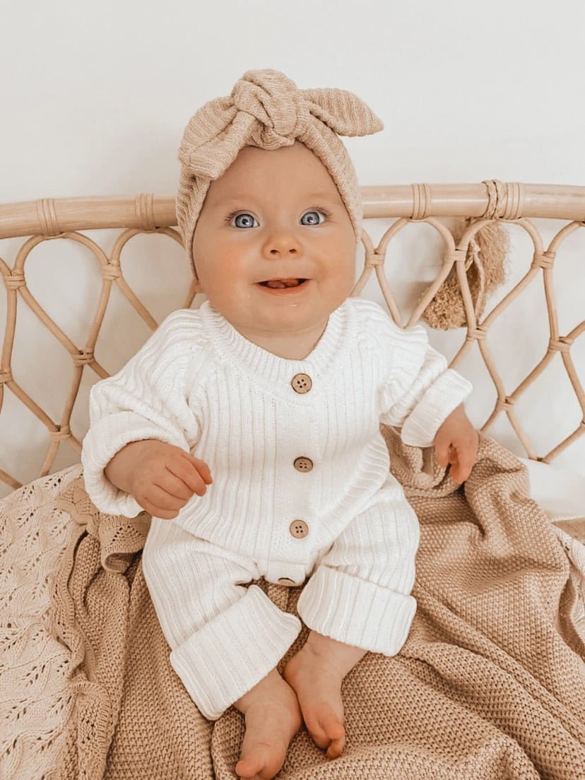 A thick luxurious ribbed romper. Featuring vintage wooden buttons with a cuffed neckline. The perfect keepsake piece to announce the birth of your little one & A must have essential for your little treasures winter collection. This piece is made to grow with your little one, simply roll up/down the sleeves & legs as needed.