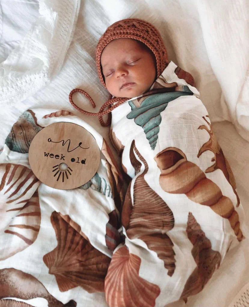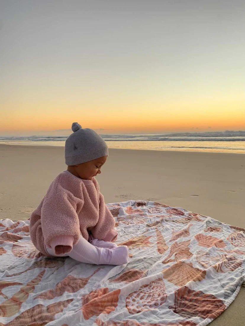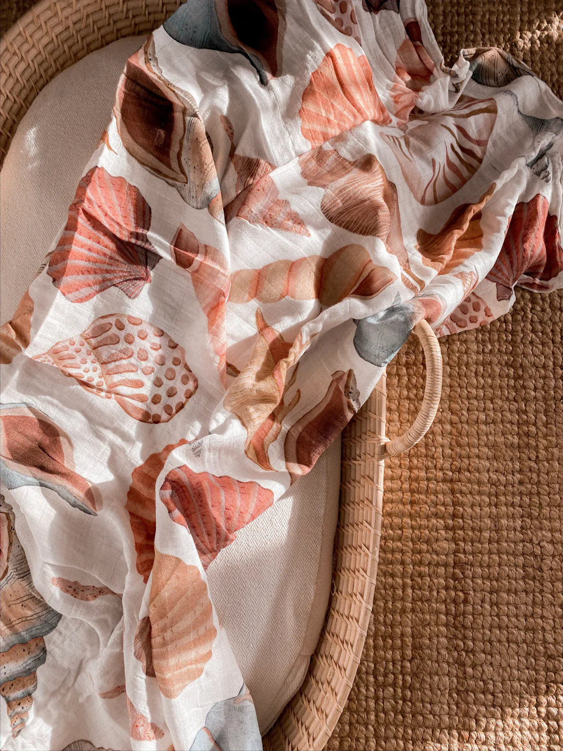 With versatility in mind, they can be used for swaddling, nursing, a lightweight blanket, pram covers and bassinet sheets and for our Mama’s they’re used as throws, outdoor towels and our favourite way, a sarong for the warm summer months.