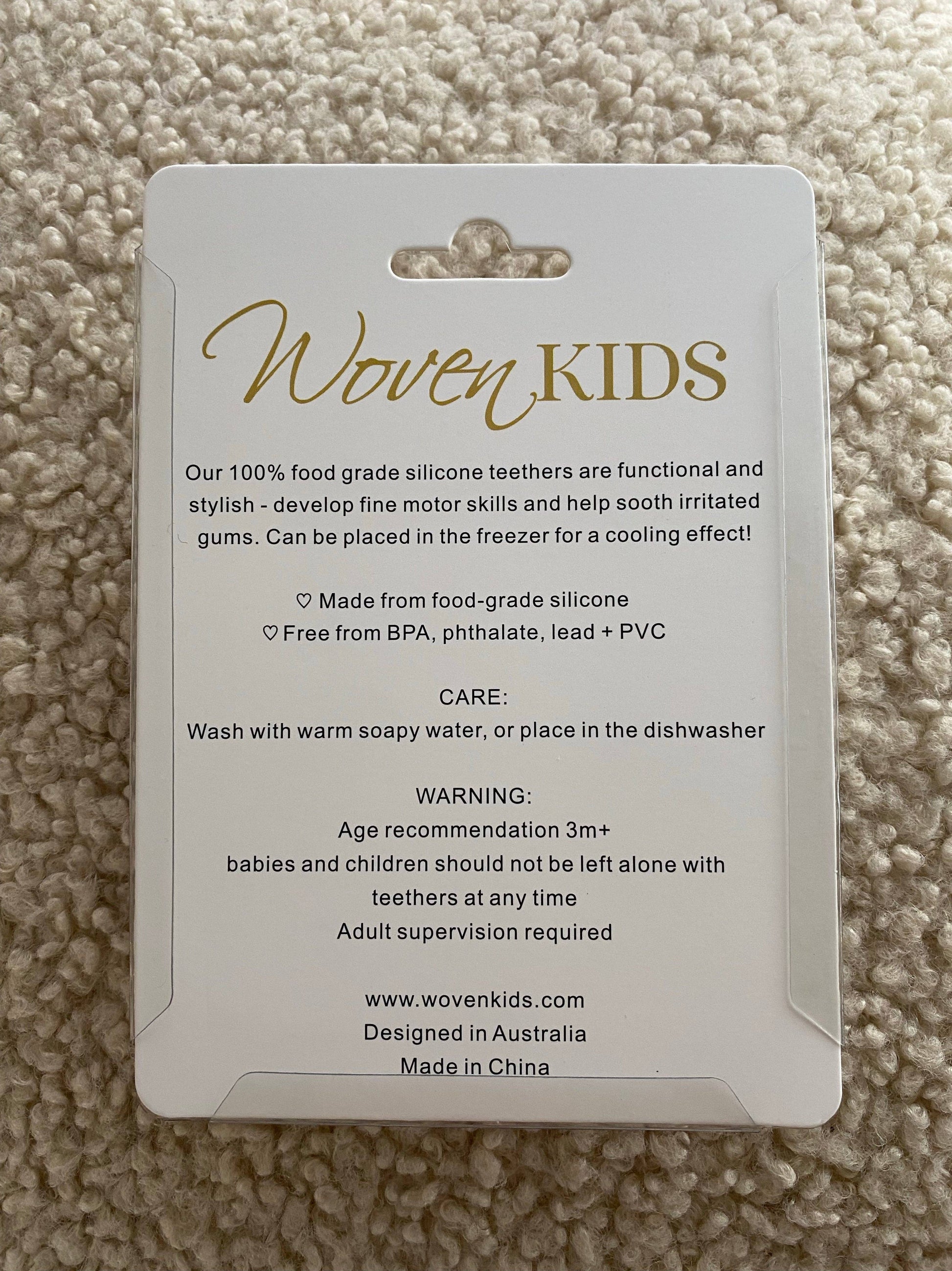 Our 100% food grade silicone teethers are functional and stylish - develop fine motor skills and help sooth irritated gums. Can be placed in the freezer for a cooling effect! * made from food grade silicone * free from BPA, phthalate, lead + PVC CARE:  Wash with warm soapy water, or place in the dishwasher  WARNING:  Age recommendation 3m+ babies and children should not be left alone with teethers  adult supervision required Complies with mandatory safety standards AS/NZS8124.1, 8124.2 and 8124.3