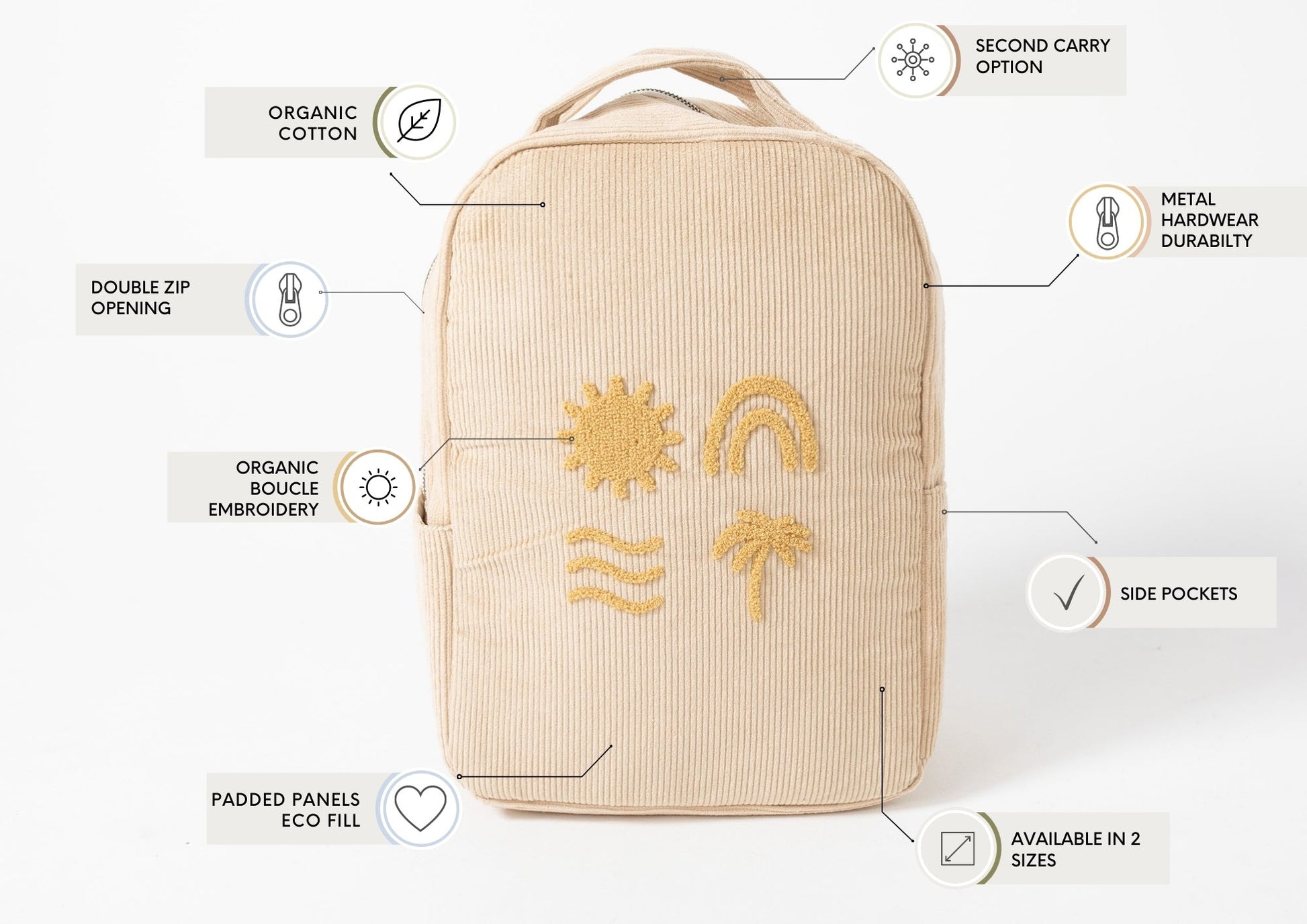 Outer: 100% Organic Cotton Corduroy / Lining: 100% Recycled Nylon / Fill: Eco-friendly Pearl Cotton padding.: MINI - Measures 30cm x 24cm x 11cm