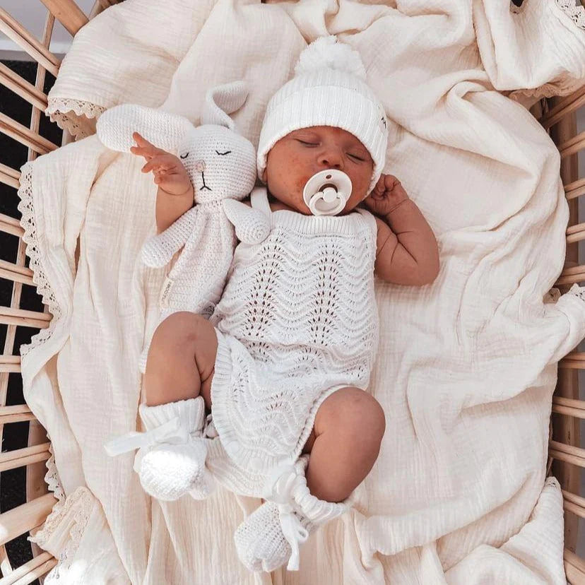 A true baby wardrobe staple! Our Textured Knit Beanie with Pom Pom is a baby accessory must have. Made from the softest cotton to keep your baby's head warm whilst still being able to breathe. Throw in your nappy bag and have it ready to go once that afternoon chill sets in.
