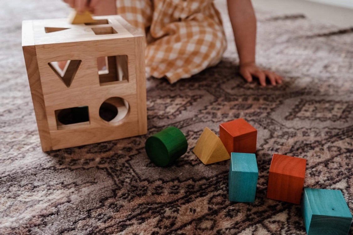 Postbox shape sorter that encourages recognition of shapes. With eight blocks in various shapes and colours, children will have fun sorting through them and placing them in the correct holes. All materials used are child-safe and non-toxic.